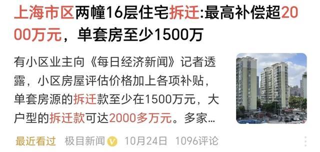 上海市区两幢16层住宅拆迁:最高赔偿超2000万元,单套房至少1500万。